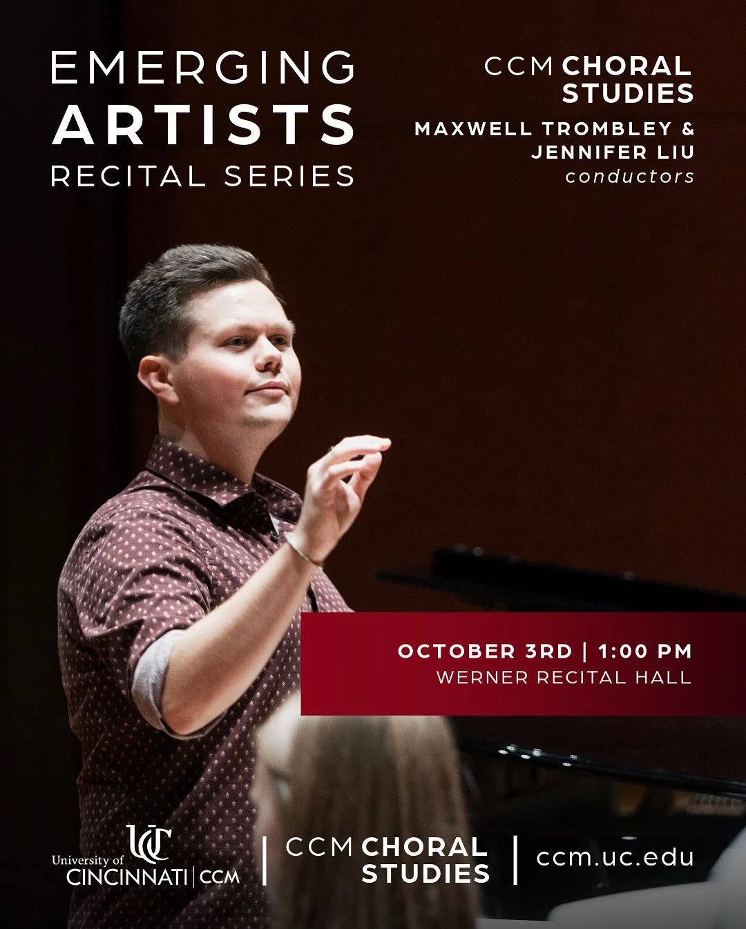 CCM Emerging Artists Recital Series Friday, October 3, 2025 1:00 PM 2:00 PM University of Cincinnati Werner Recital Hall Cincinnati OH (map) Google Calendar ICS Maxwell Trombley will conduct the University of Cincinnati College-Conservatory of Music Chamber Singers on Friday, October 3rd in the Werner Recital Hall. The program includes selections from Haydn’s St. Nicholas Mass. Program